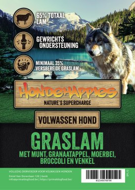 65% Lam (35% Versbereid Graslam, 22% Gedroogd Lam, 5% Lamsvet), Zoete Aardappel, Bonen, Bietenpulp, Gedroogd Superfoodmengsel* (Inclusief Munt, Granaatappel, Moerbei, Broccoli, Venkel), Omega 3-supplement, Mineralen, Fructo-oligosachariden (FOS, 175 mg / kg), Mannan-oligosacchariden (MOS, 50 mg / kg), Olijfextract (0,01 %)Ruw Eiwit 27,5%