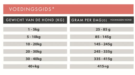 Zalm & Forel 50% (inclusief Versbereide Zalm & Forel 36%, Gedroogde Zalm 12% en Zalmbouillon 2%), Zoete Aardappel (24%), Erwten (9%), Aardappelen, Bietenpulp, Lijnzaad, Omega 3 supplement, Mineralen, Asperges (0,3%), Fructooligosacchariden (FOS, 96 mg / kg), Mannanoligosacchariden (MOS, 24 mg / kg)